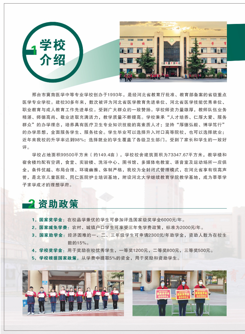 邢台冀南医学中等专业学校。始建于1993年5月,是经河北省教育厅批准、教育部备案、面向全国计划内招生的一所全日制省级重点医学专业学校。办校三十年来,学校构建了以向高等院校输送专本科新生的学历教育,以培养具有医疗卫生专业技能的高素质人才的职业教育,及在职进修提高素质的成人教育为一体的职教框架。