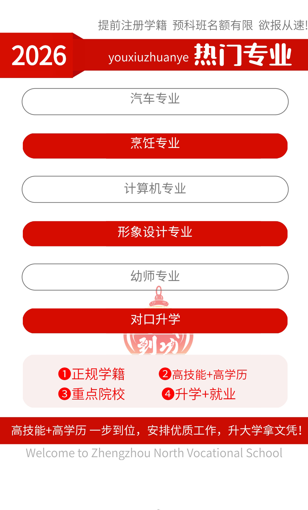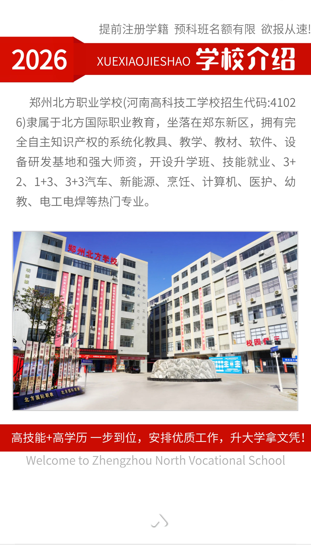 郑州北方职业学校(河南高科技工学校招生代码:41026)隶属于北方国际职业教育,坐落在郑东新区,拥有完全自主知识产权的系统化教具、教学、教材、软件、设备研发基地和强大师资,开设升学班、技能就业、3+2、1+3、3+3汽车、新能源、烹饪、计算机、医护、幼教、电工电焊等热门专业。
