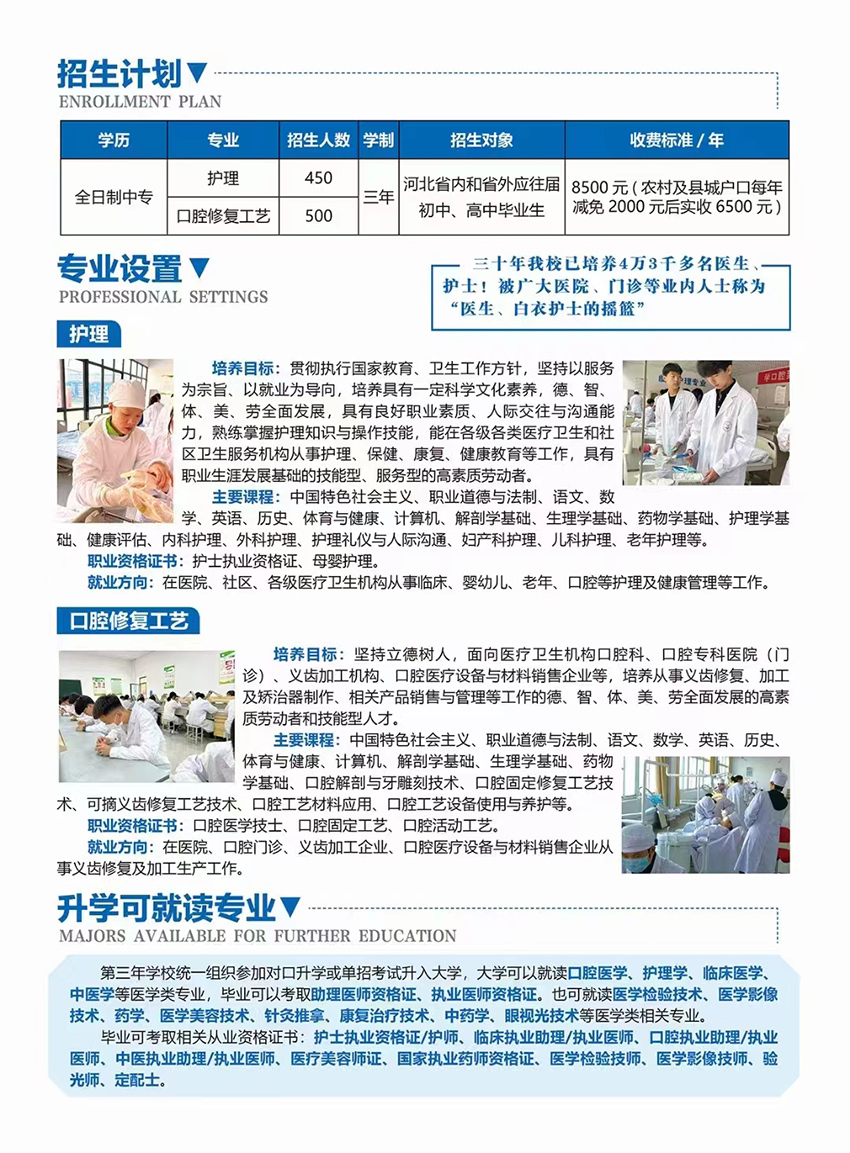 招生专业:护理、口腔、中医、医学美容等热门专业。